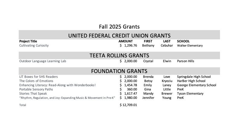 The Springdale Public Schools Education Foundation Board of Directors will accept requests for the Spring grant cycle from March 1st through May 1st.